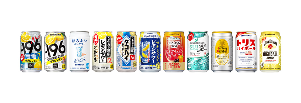 また、-196℃製法由来の浸漬酒により果実味をしっかり感じることができる、うまい無糖※2チューハイ「-196〈無糖〉」や、若者に向けたアルコール度数3%の“ほのかな甘みとやさしい飲み心地”の「ほろよい」、飲食店で人気に火がついたハイボールを自宅でも手軽に楽しめる「角ハイボール缶」、お店の味が手軽に缶で楽しめる「こだわり酒場のレモンサワー」、日常の食事に合う爽やかな味わいを気軽に楽しめる「翠ジンソーダ缶」、レモン果皮由来のみずみずしい香り、コクとほろ苦さ、豊かな余韻を香料・糖類無添加で実現した「THE PEEL」、 アルコール0.00%なのにお酒らしい味と気分を楽しめるノンアルコールRTDとして「のんある気分」や「のんある酒場」など、酒類・食品の各事業分野で蓄積した技術力を活かして新しい価値をもつ商品を開発してきました。
