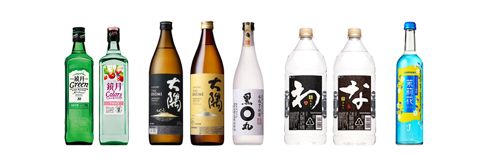 甲類焼酎では、「雪岳山(ソラクサン)」の銘水で仕上げた澄みきった味わいが特徴の「鏡月Green」を販売しながら、「鏡月Colorsアセロラ」などのフレーバー焼酎も展開しています。乙類焼酎では、大隅酒造の焼酎づくりにサントリーに蒸溜酒づくりの知見を活かした大隅〈芋〉〈麦〉も展開しています。また、九州、沖縄の文化や歴史に根ざした蔵元と共同開発したこだわりブランドを中心に展開しています。甲乙混和焼酎では、飲食店様向けの「麦焼酎わんこ」や「芋焼酎なんこ」、 さらにジャスミン茶葉からつくった爽やかな香りの焼酎乙類と、すっきりした後口の焼酎甲類をあわせたジャスミン焼酎「茉莉花」を展開しています。また、ジャスミン焼酎「茉莉花」のジャスミン茶割り「JJ」を缶で展開することで、焼酎を幅広い層のお客様に楽しんでいただけるよう、新たな挑戦を続けています。