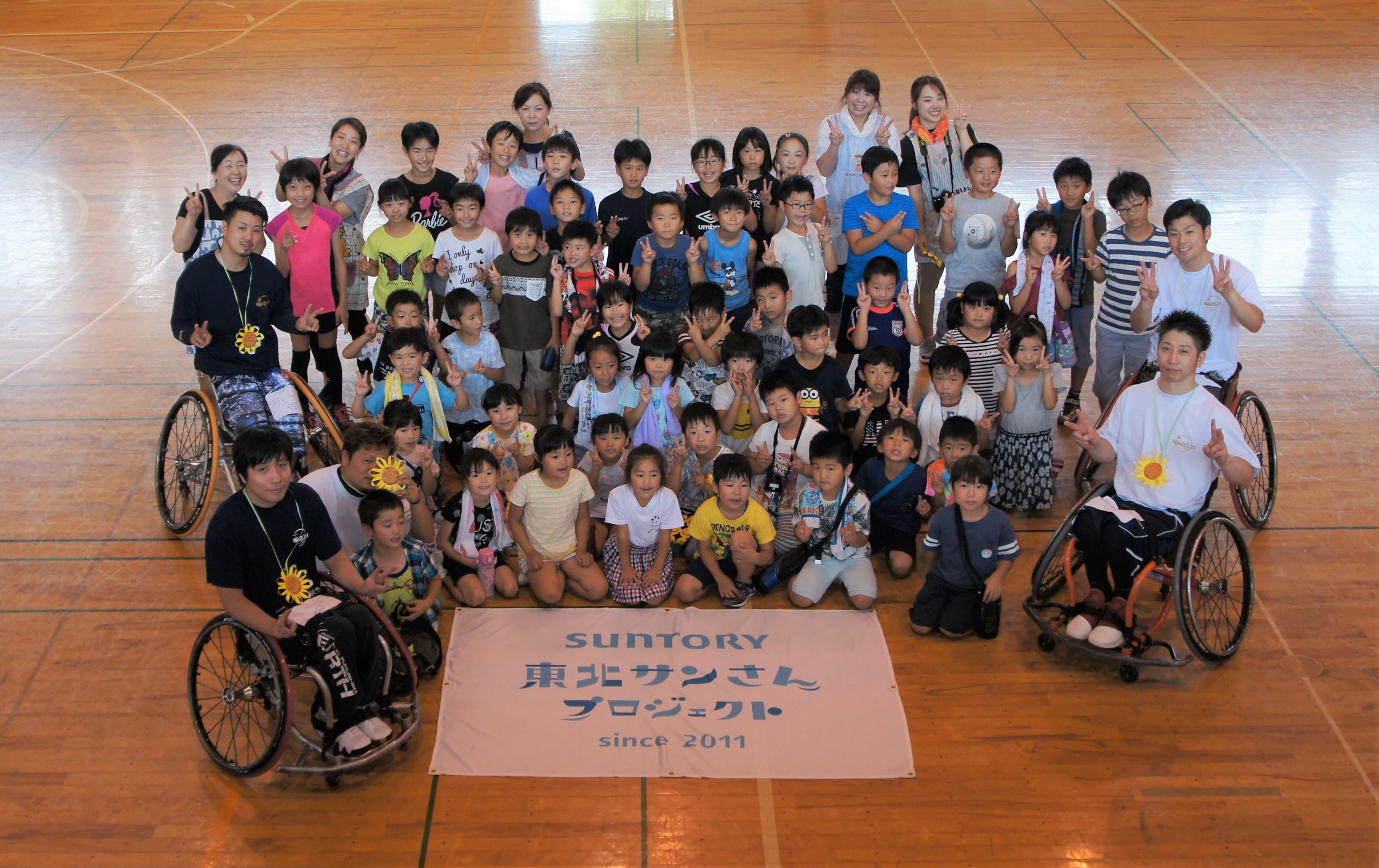 サントリーグループの東日本大震災復興支援活動「サントリー東北サンさんプロジェクト」の一環として、8月2日に、相馬市中央児童センター第二児童クラブに通う小学生を対象に車いすバスケットボール体験教室を行いました。