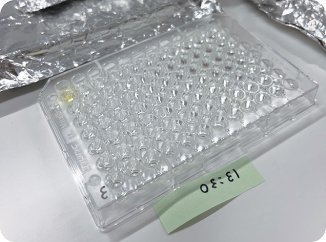 透明な上澄み液をプレートに入れて抗体と反応させ、ウイルスの有無を検査。ウイルスがあると黄色く変化する。