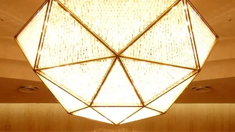 ホワイエの天井をご覧ください。光のシンフォニー「響」と題されたこの巨大なシャンデリアが燦然と輝いています。作者は、世界的に活躍する照明デザイナーの石井幹子氏。