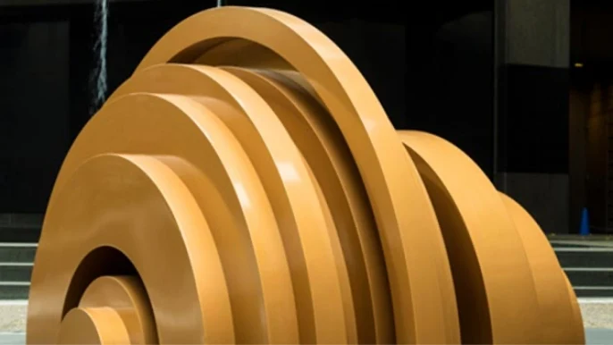 エントランス前には「響」をテーマにした金色のモニュメントがあります。響きの広がりを彷彿とさせる半円が並べられています。作者は、サントリーホールのシンボルマークもてがけた世界的グラフィック・デザイナー、彫刻家の五十嵐威暢氏。このモニュメントの設置面(底面)は、シンボルマーク「響」の形になっています。