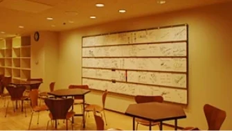 大ホールの舞台裏には、カウンターを備えたアーティスト・ラウンジを設け、アーティストたちが演奏前後の休憩時にゆったりとくつろぐことができます。ここにはサントリーホールに出演した数多くのアーティストのサインが飾られています。