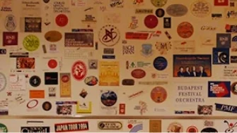 ラウンジの脇にあるロッカーは、世界中のオーケストラやアンサンブルがサントリーホールに来るたびに自分たちのステッカーを貼っていくのが恒例になっています。