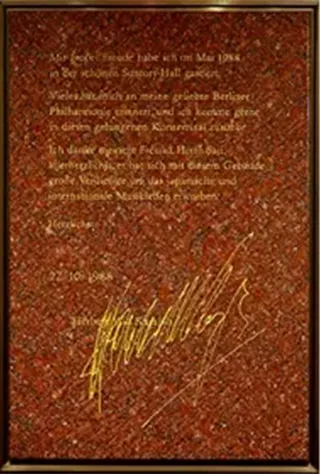 わが友、佐治敬三氏に心より深く感謝いたします。氏はこの建物によって、日本の、そして、世界の音楽生活に大きな貢献をいたしました。心をこめて。