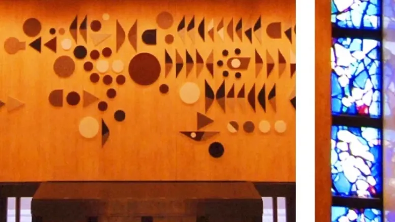 エントランス上の内壁には、「響」をテーマにしたモザイク壁画があります。これは、日本を代表する抽象画の巨匠、故宇治山哲平 画伯の最晩年の作品です。壁画の両端や、大ホール2階廊下には、海外でも高い評価を得ているガラス芸術家、三浦啓子氏による「律」と題されたステンドグラスが、柔らかな光をホワイエに呼び込んでいます。
