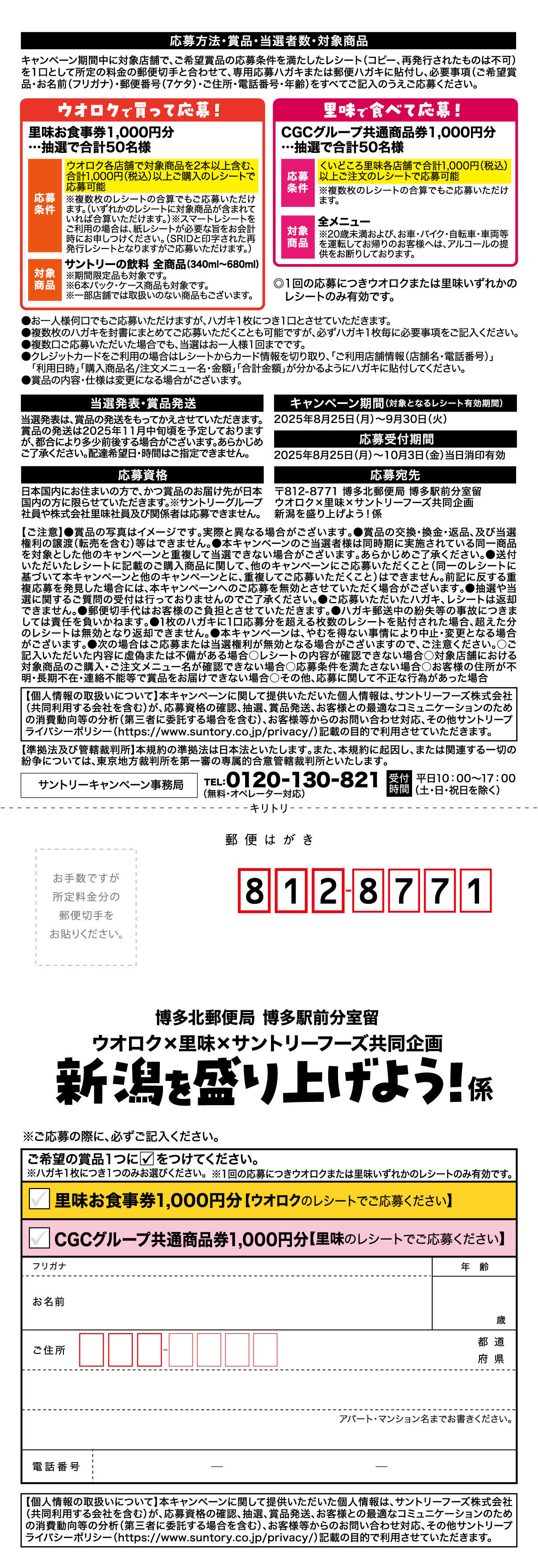 8月25日~9月30日の期間中、対象店舗でご希望商品の応募条件を満たしたレシートを1口として、ハガキに必要事項をご記入の上ご応募ください。