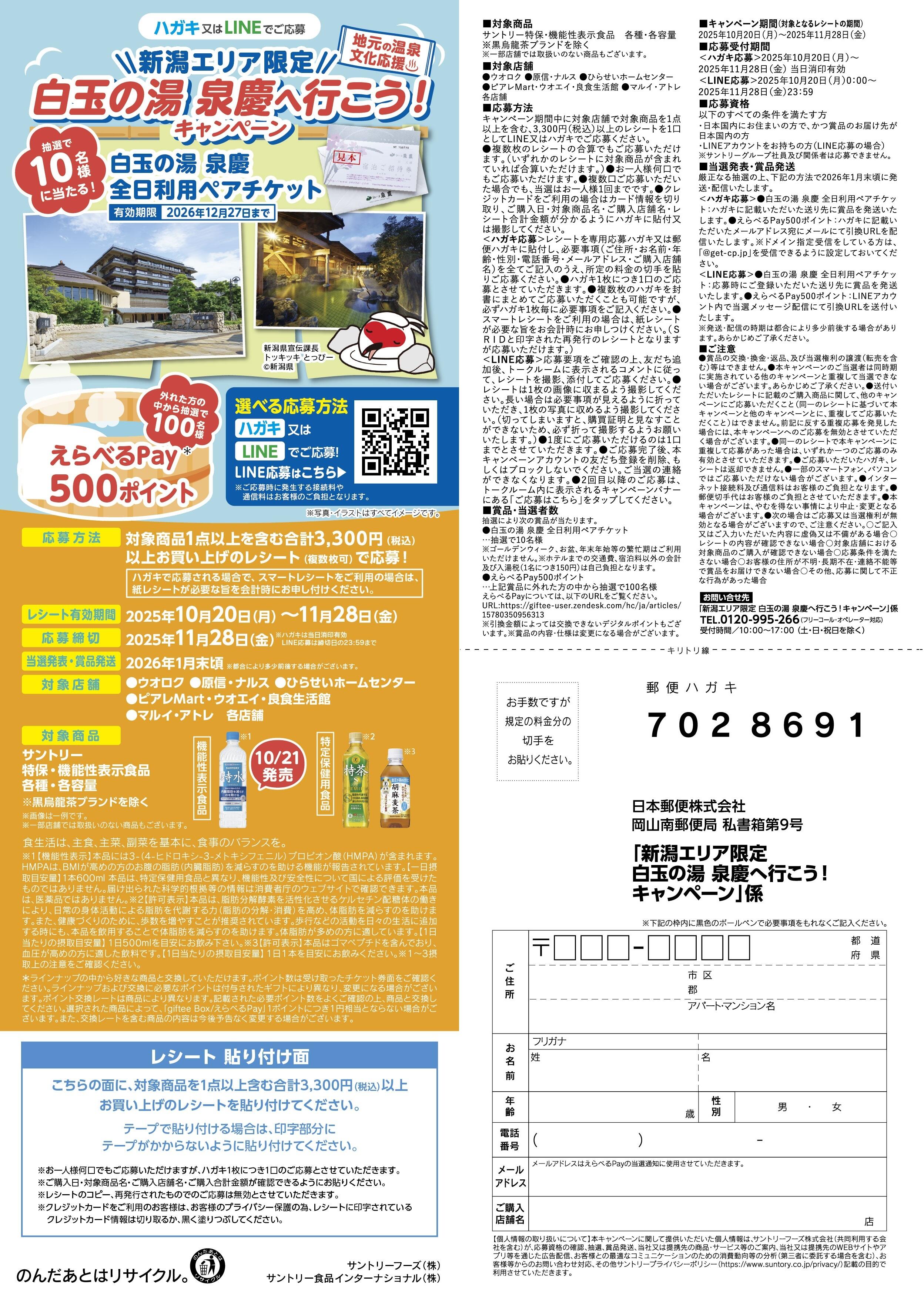 ■応募方法:キャンペーン期間中に対象店舗で対象商品を1点以上を含む、3,300円(税込)以上のレシートを1口としてLINE又はハガキでご応募ください。