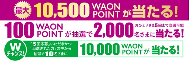 さらに、うれしいWチャンスも!期間中に5回以上ご応募され、100 WAON POINTに当選された方の中から、抽選で10名様に「10,000 WAON POINT」が当たります!