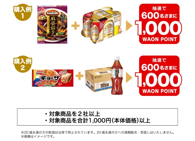 ■賞品内容:「サントリー」と「味の素」の対象商品をそれぞれ2社以上かつ合計1,000円(本体価格)以上ご購入された方の中から、抽選で600名様にイオングループで使える「1,000WAON POINT」