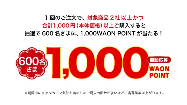 イオンネットスーパーにおける一度のご注文で、サントリーと味の素の対象商品をそれぞれ2社以上かつ合計1,000円(本体価格)以上ご購入された方の中から、抽選で600名様にイオングループで使える「1,000WAON POINT」をプレゼントします。条件を満たしていれば、注文の際に自動応募となります。一度の注文ごとに1口の応募となり、期間中に何度でもご応募いただくことができます。この機会に、ぜひお好きな商品を組み合わせて、イエ飲みをお楽しみくださいね!