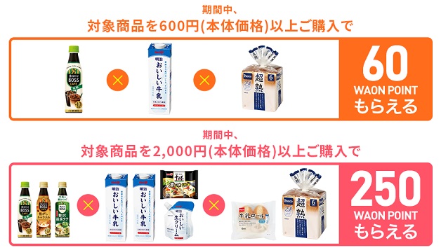 「サントリー」、「明治」、「パスコ」のうち2社以上の対象商品を600円(本体価格)以上お買い上げの方には「60 WAON POINT」、2,000円(本体価格)以上お買い上げの方には「250 WAON POINT」をプレゼントします!「WAON POINT」は1ポイント=1円から、イオングループなどでのお支払いにご利用いただけます。ゲットしたポイントは毎日のお買い物に役立ててくださいね♪