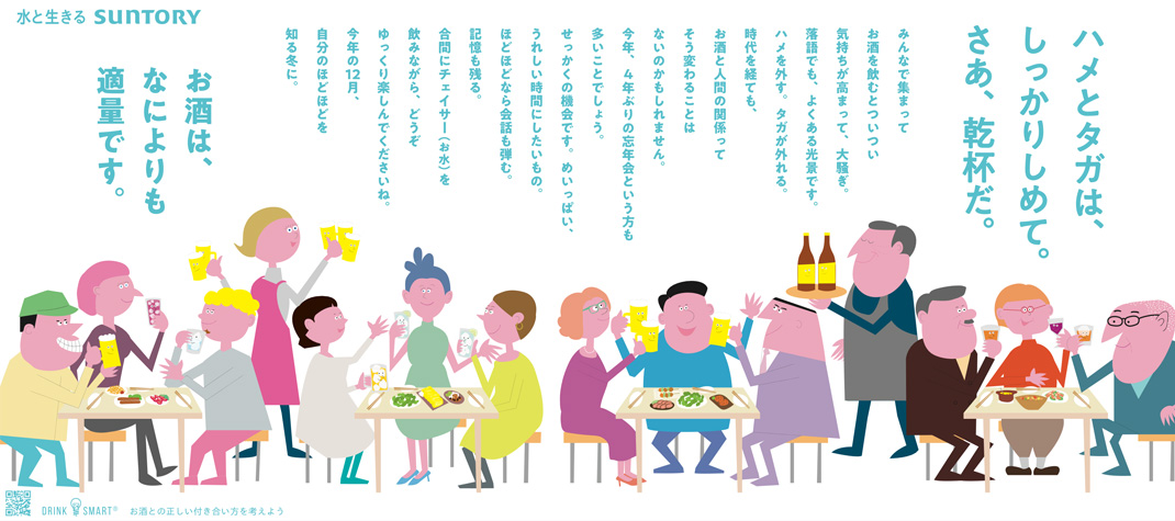 モデレーションとは、「ほどほど」あるいは「中庸」という意味。サントリーでは、1986年から業界に先駆けて、「酒は、なによりも適量です」というメッセージを盛り込んだモデレーション広告を全国紙で展開、適正飲酒の大切さを訴え続けています。さまざまな飲酒にまつわる啓発を行い、適正飲酒について理解を深めていただくように努めています。