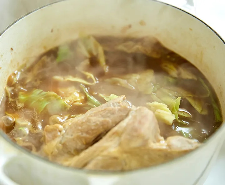 鍋に豚肉を入れる。肉を焼いたフライパンに水の一部を入れて火にかけ、フライパンに残った肉汁をヘラで溶かしてから鍋に加える。残りの水も足して30分煮込む。
