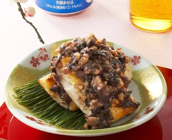 バターが固まってもったりした黒豆マッシュを、焼いた餅にからめる。