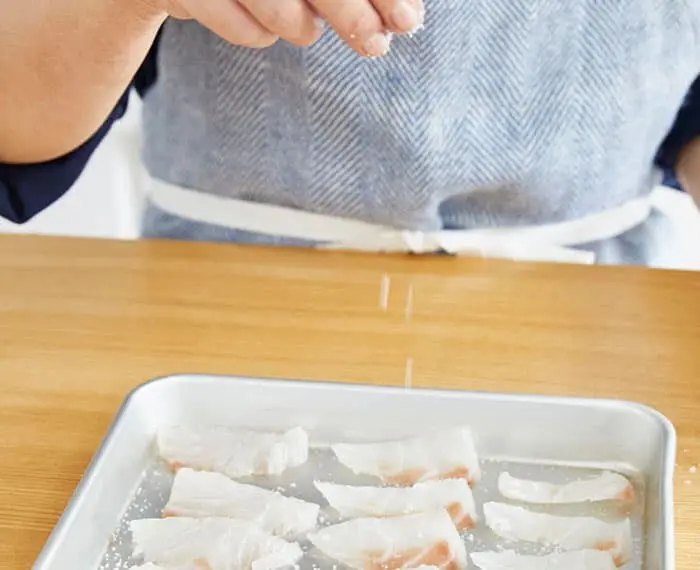 鯛は厚さ5㎜のそぎ切りにし、両面に薄く塩をふって30分置き、水気を拭う。鍋に甘酢の材料を合わせてひと煮立ちさせ、冷ます。