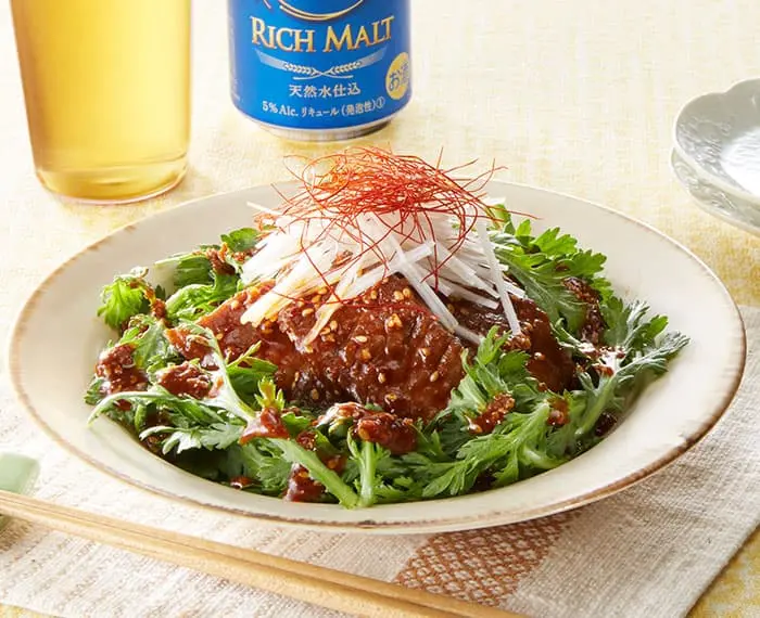 春菊の葉はたっぷり添えて。ご飯に春菊と焼き肉をのせ、焼き汁をかけて丼仕立てにしても、おすすめです。