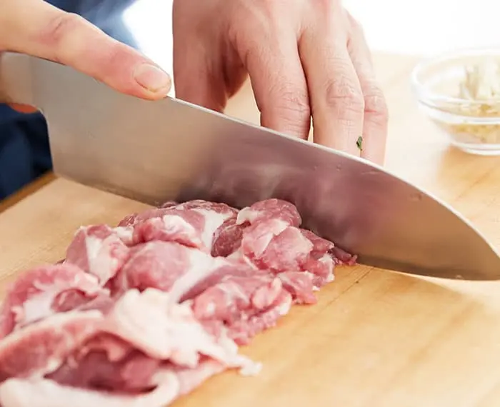 豚肉は食べやすい大きさに切る。生姜はせん切りにする。絹さやは両筋を取り、塩少量を加えた湯で1分ほど茹で、ザルに上げて粗熱を取る。斜めに半分に切る。