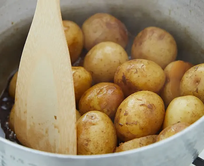 鍋を揺すってじゃがいもを転がして、煮詰まった煮汁を全体に絡める。