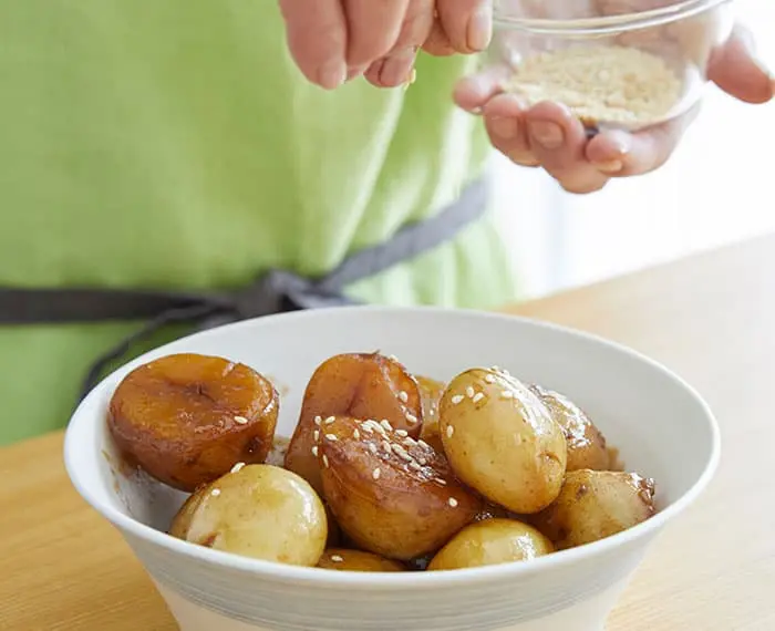 出盛りの新じゃがいもは皮を剥かずに調理できるのでとても便利。お惣菜の定番「煮っころがし」をはじめ、焼いたり、揚げたりと食卓に上る機会も増えます。今回は甘辛く味を絡めた煮っころがしに、バターのコクを加えた「つや煮」をつくります。新じゃがいもは皮付きのまま、最初に油で少し炒めます。水と調味料を加えて煮て、芯まで火が通ったら、バターを加えて煮詰めた煮汁を絡めます。煮汁を絡めるときは鍋を揺すって、じゃがいもを文字通り「煮っころがし」て仕上げます。じゃがいもの持ち味とほっくりとした食感が愉しめる一品です。