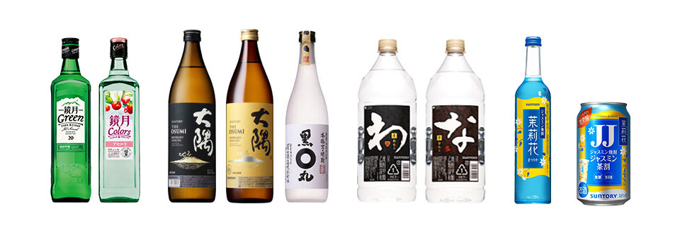 甲類焼酎では、「雪岳山(ソラクサン)」の銘水で仕上げた澄みきった味わいが特徴の「鏡月Green」を販売しながら、「鏡月Colorsアセロラ」などのフレーバー焼酎も展開しています。乙類焼酎では、大隅酒造の焼酎づくりにサントリーに蒸溜酒づくりの知見を活かした大隅〈芋〉〈麦〉も展開しています。また、九州、沖縄の文化や歴史に根ざした蔵元と共同開発したこだわりブランドを中心に展開しています。甲乙混和焼酎では、飲食店様向けの「麦焼酎わんこ」や「芋焼酎なんこ」、 さらにジャスミン茶葉からつくった爽やかな香りの焼酎乙類と、すっきりした後口の焼酎甲類をあわせたジャスミン焼酎「茉莉花」を展開しています。また、ジャスミン焼酎「茉莉花」のジャスミン茶割り「JJ」を缶で展開することで、焼酎を幅広い層のお客様に楽しんでいただけるよう、新たな挑戦を続けています。