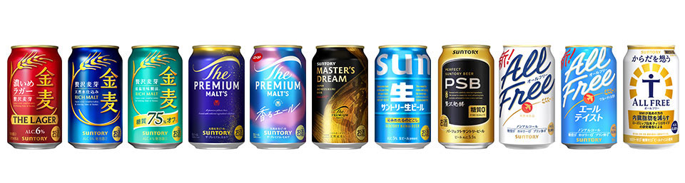 1986年に麦芽100%の生ビール「モルツ」を発売、さらに1994年には、「ホップス<生>」を発売し、発泡酒という新しい市場を創造。 続いて、原料にコーンを採用した「ジョッキ生」、麦の旨みを追求した「金麦」、糖質オフの「金麦<糖質75%オフ※1>」を発売するなど、新しい価値の提案を継続して行っています。 2015年、スーパープレミアムクラスの「~ザ・プレミアム・モルツ~ マスターズドリーム」、2016年には、“エールビール”の新提案として「ザ・プレミアム・モルツ〈香る〉エール」を発売しました。 また、需要が高まるノンアルコールビールテイスト飲料においても、2010年に世界初※2、アルコールゼロ・カロリーゼロ・糖質ゼロという「3つのゼロ」※3を実現した「オールフリー」を発売。機能面のみならず、“ビールらしい味わい”と“すっきりとした後味”に高い評価をいただいています。 2019年には、機能性表示食品の「からだを想うオールフリー」を発売しました。2021年には、“本格ビールの味わい”と“糖質ゼロ”※3という機能を両立した「パーフェクトサントリービール」を発売、さらに炭酸水で割って楽しむ新しいスタイルのビール「ビアボール」の発売で新しい市場を切り拓きました。