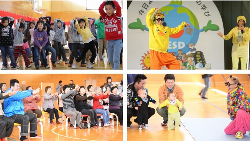 およそ一時間のイベント内容は、南流石さんの司会進行により、白井貴子さんのオリジナル楽曲などを披露した後、*ESDメッセージソングとして制作された「僕らは大きな世界の一粒の命」(作詞作曲/白井貴子・振付/南流石)、世代を越えて心に響く「あの素晴らしい愛をもう一度」などを、会場内全員で歌い踊りました。イベントの最後には、南流石さんが震災前の2010年度に岩手医科大学とNHKと流石組で共同制作をした、老若男女が楽しんで体を動かす事ができる「ココロからダンス」でクールダウンを行い、会場は一体感に包まれました。その後、参加者全員での記念撮影。
