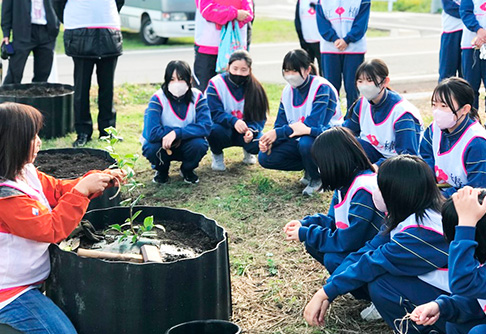 - 地元学校の卒業記念行事として椿の植樹が伝統になってきています。さらに、多くの企業やインターナショナルスクールが、研修の一環として椿学習や椿植樹を取り入れ始め、この活動が地域に浸透してきました。