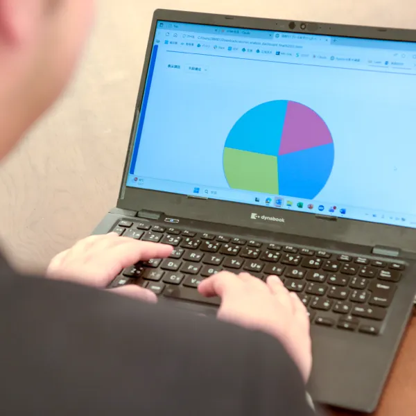 約2年間営業を経験し、現在は広域営業本部のリテールAI推進チームで、AIを活用したデータ分析や小売DXの知見を学んでいます。その一環として、お得意様の企業が提供する研修プログラムにも参加し、小売DXやAI分析に関する実務的な知識を体系的に身に付けています。研修で扱う購買データを読み解いていくと、営業時代には“感覚”で捉えていた顧客行動が数字などに可視化され、背景がより深く理解できるようになりました。現場での経験とデータ分析の視点が結びつくことで、より深い仮説づくりや課題設定ができるようになり、自分の視野が大きく広がっていることを実感しています。