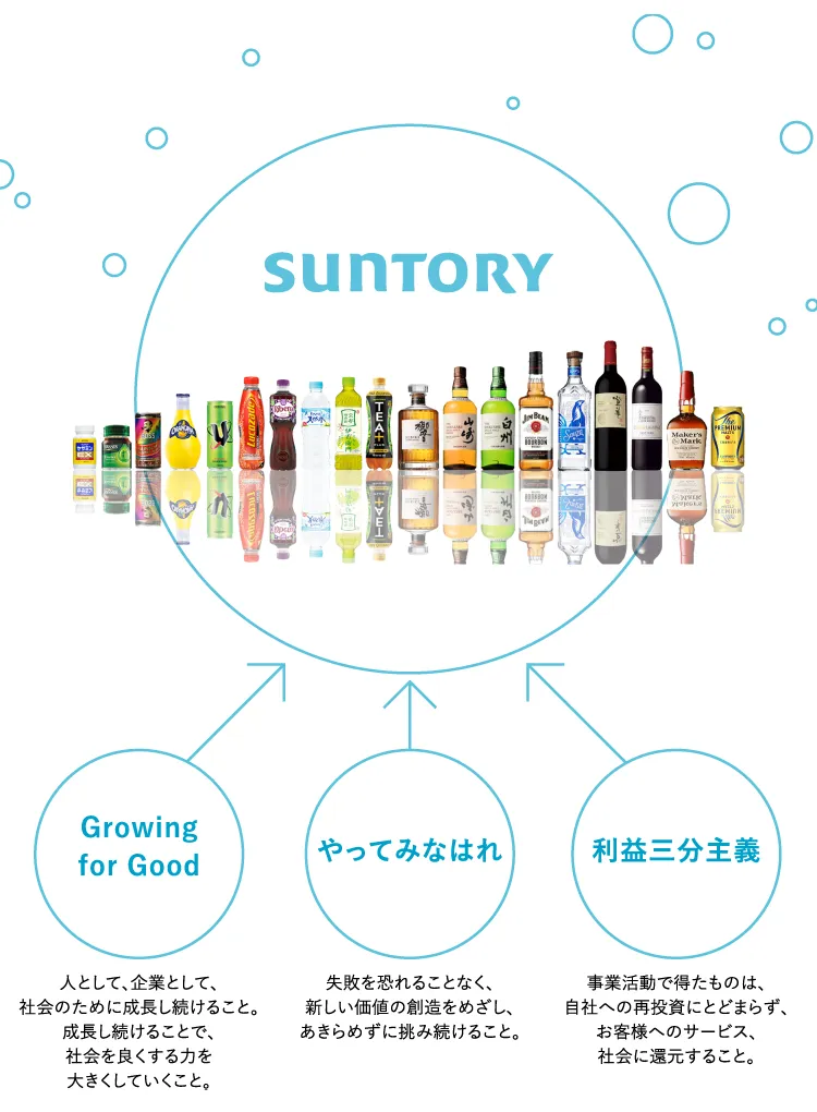 パーパスを実現するためには、創業から脈々と受け継いできた「一人ひとりが個性と能力を最大限に活かし、 失敗を恐れず挑戦し続けること」が大切です。そのために、ONE SUNTORY One Familyとしての一体感醸成と、自分らしくイキイキと挑戦し続けられる環境整備を進めています。