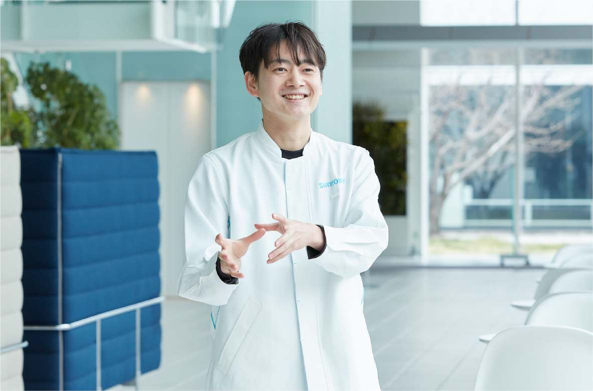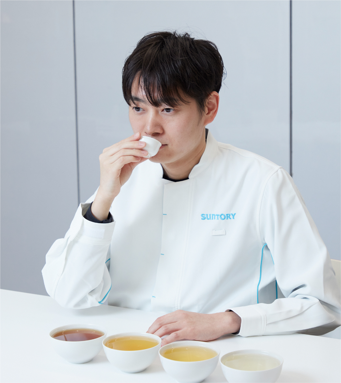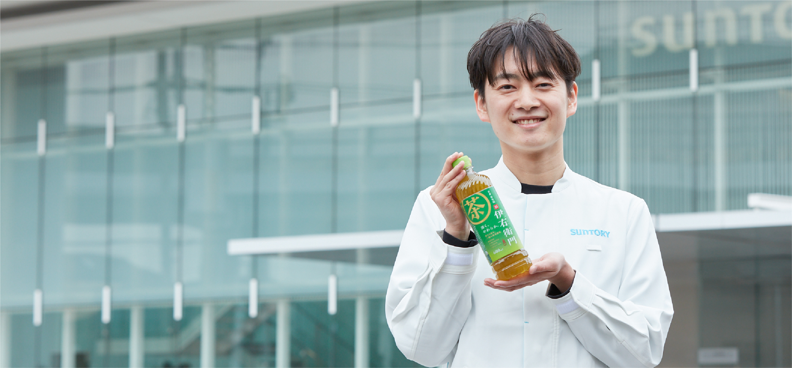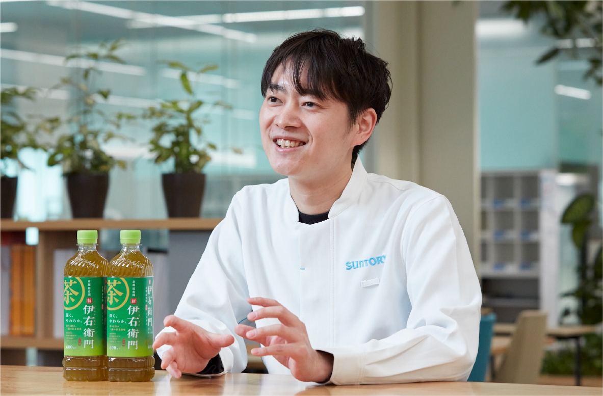 私はSBFジャパン商品開発部に所属し、主に「伊右衛門」の商品開発を担当しています。「伊右衛門」の開発では200年以上の歴史を持つ茶舗、福寿園と共同し様々な茶葉の評価や配合の設計、さらに「伊右衛門」をより美味しくお客様に飲み続けていただけるよう、新たな原料探索や茶葉の美味しさを引き出す技術開発を関係部署と連携して進めています。