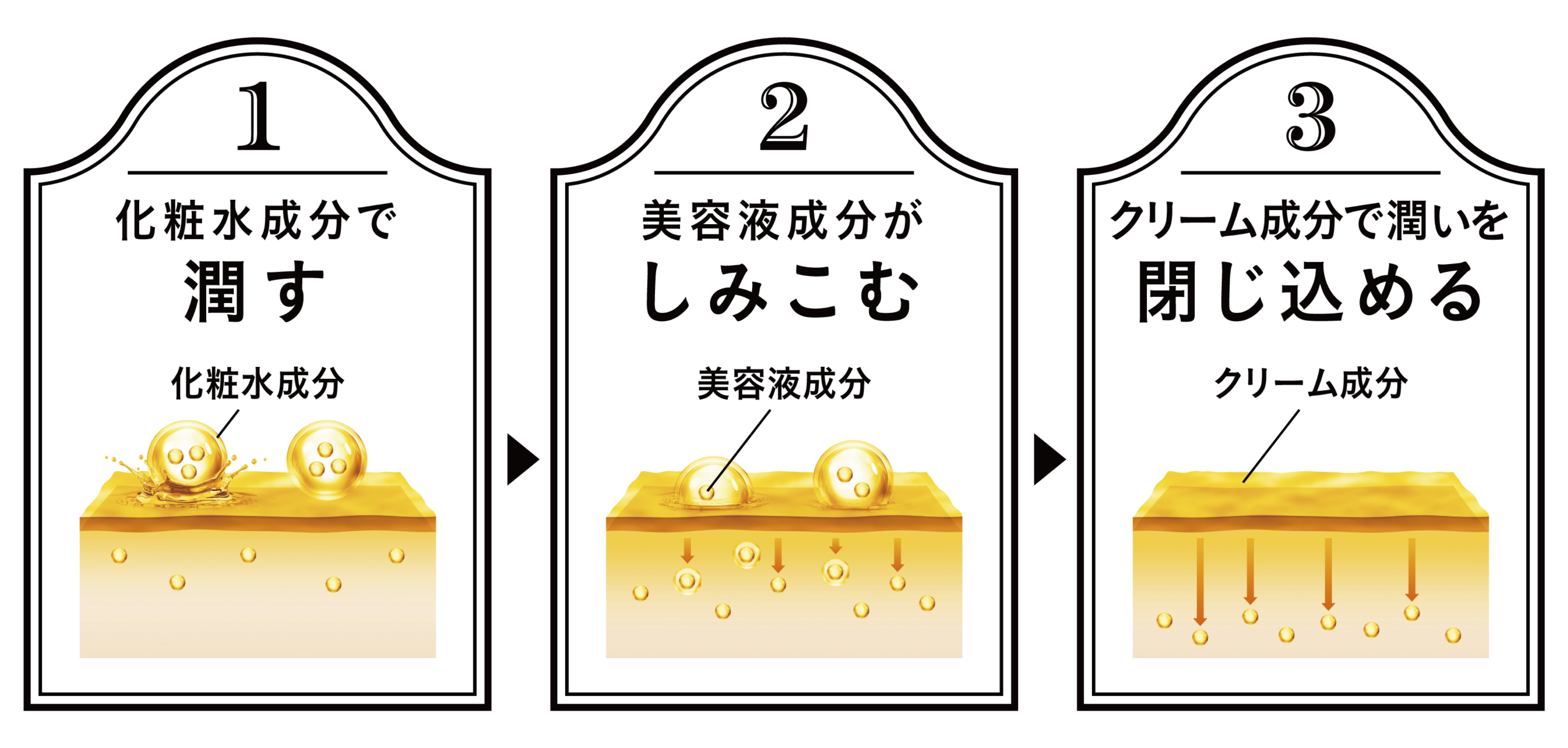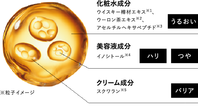 これにより1本でスキンケアに重要な「化粧水」「美容液」「クリーム」成分が時間差で、肌へ順番に浸透する機能を実現。心地よい使用感と肌への圧倒的な体感をお客様に提供しています。