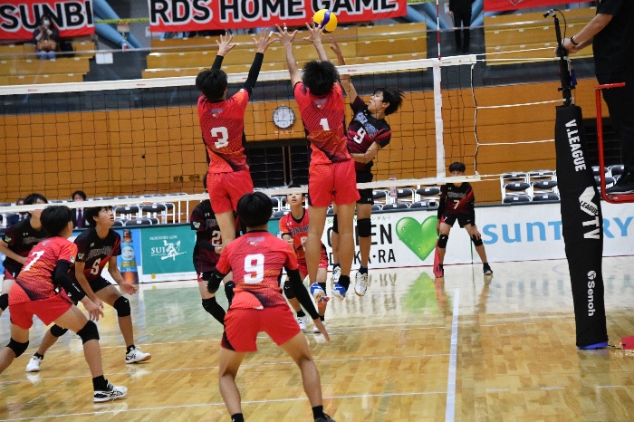 サントリーサンバーズ V.LEAGUE開幕戦が箕面のスカイアリーナで行われ、それに先立ち、サンバーズジュニアチームのエキシビジョンマッチを開催しました。