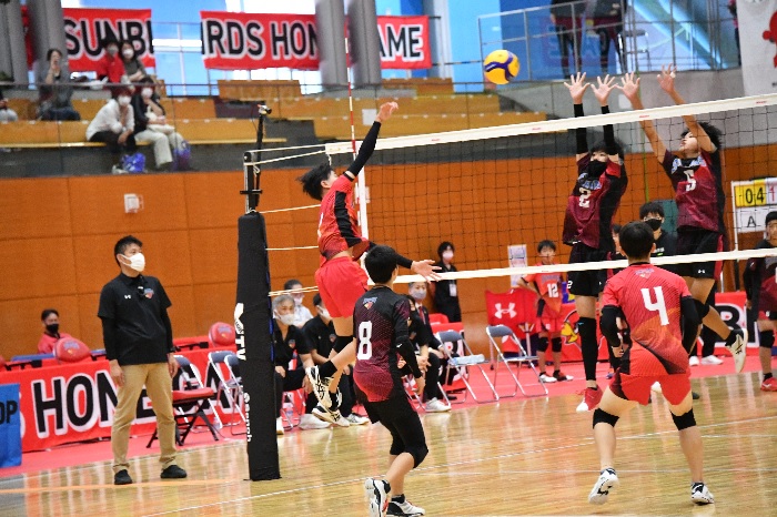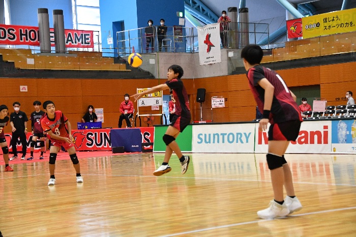 選手の保護者を含め沢山の方が見守る中、選手が試合を準備。主審を荻野アンバサダー(元サントリーサンバーズ・日本代表選手)、副審を津曲(元サントリーサンバーズ・日本代表選手)が務め、紹介された際は会場から大きな歓声があがりました。続いて選手が整列、サントリーサンバーズホームゲーム演出チームにより出場選手が紹介され、試合開始前から会場は大盛り上がり!それぞれがパフォーマンスをして見ている人にアピールしました。