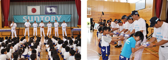 6月23日(月)、東日本大震災復興支援活動「サントリー東北サンさんプロジェクト」は7人のプロ野球選手OB*を特別講師に招き、福島県いわき市立中央台東小学校にて「心をつなぐキャッチボール教室」を開催しました。教室は同学校に在籍する約150人の子どもたちを対象に体育の特別授業として実施され、初心者でも楽しめるキャッチボールの投げ方・正しい走り方講座などが行われました。