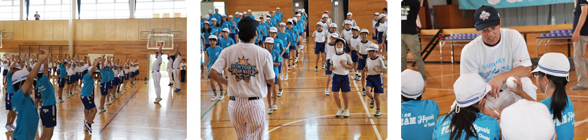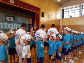 講師が登場すると、間近で見るプロ野球選手OBの体の大きさに子どもたちも最初はびっくりした様子。講師がひとりずつ笑顔で挨拶をはじめると、子どもたちは元気いっぱいになり「この日の体育の授業をすごく楽しみにしていた」という声が飛び出しました。