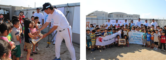 キャッチボール教室終了後、講師の7人はサントリー東北サンさんプロジェクトの一環である「フクシマ ススム プロジェクト」によって同小学校敷地内に建設中の学童保育クラブを訪問。学童保育クラブ建設に向けた思いや説明を聞くと、吉村選手は「少しでも早く、子どもたちが笑顔で元気に遊べる場所が増えるよう応援したい」と話していました。最後に講師たちから子どもたちへの応援の印として、サインボールと記念写真がプレゼントされました。