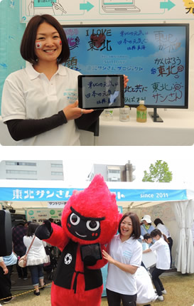 サントリー東北サンさんプロジェクトは、メイン会場にて、「サントリー東北サンさんブース」として参加。ブースでは、復興へのメッセージをデジタル横断幕に書き入れる「みんなで復興横断幕をつくろう!」企画を実施しました。