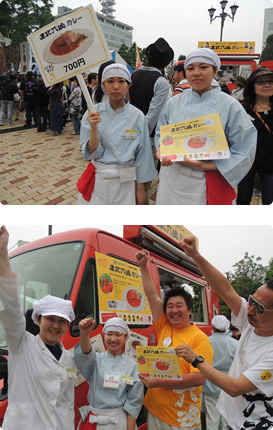 人気グルメブロガー集団「たべあるキング」と人気フレンチ「GINZA kansai」の坂田幹靖シェフのコラボレーションでうまれた「東北六魂カレー」は、岩手県立宮古水産高校の生徒たちが調理や販売を頑張ったおかげもあり、大好評となり、お昼すぎには完売してしまうほどの売れ行きだったとか。