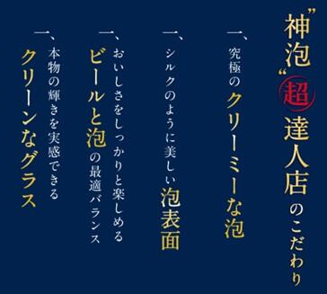 「神泡超達人店」とは、その中でも特に、注ぎ方や提供品質において高い基準をクリアしたお店として認定されたお店であり、徹底的にこだわり抜いた究極の状態で"神泡"の『ザ・プレミアム・モルツ』をお楽しみいただけます。