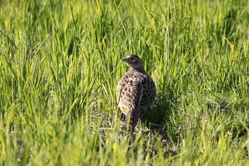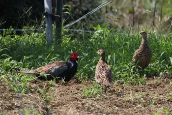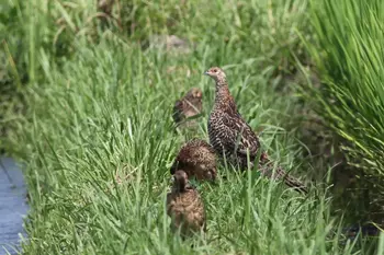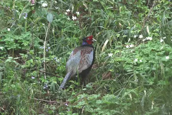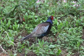 オスは濃い緑色の体で、繁殖期になると、ハート型の赤い顔になり、「ケーンケーン」と鳴きながらメスを求めます。昔から日本人とかかわりの深い鳥として、「桃太郎」をはじめいろいろな物語や、「焼野の雉(きぎす)、夜の鶴」などの子を思う親の愛情の深さを表わすタトエ話がありますが、現在でも草刈機に頭をとばされてしまうメスが出るほど巣の卵を大切にしています。「朝キジが鳴けば雨、地震が近づけば大声で鳴く」といった予知能力まで与えられていると言われます。