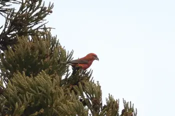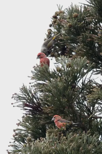 全長18cm。オスは全身暗赤色で翼と尾は暗褐色。メスは灰色がかった黄緑色の体をしています。本種の最大の特徴は、頭の割りには大きいくちばしの上下が合わさらず、先の方は左右に分かれていて、更に下くちばしの先は上に向き、上くちばしの先は下を向いていることです。「イスカの嘴(はし)の食違い」と古くから言われている由縁です。このくちばしは上下を少し開き加減にしてマツボックリ(マツカサ)の間に入れ込み、そのくちばしを合わすと、先が曲がって食い違っているためにマツボックリの笠の間を押し広げ、中の種子を容易に取り出すことができるのです。マツカサをつつけるアカマツ、クロマツ、カラマツ、エゾマツ、トドマツなどの針葉樹やハンノキ類の実を主食にしています。生息環境は針葉樹林で、雛を育てるのにもマツ類の実を与えています。夏に繁殖することも多いのですが、積雪のある冬に行なわれることもよくあります。日本では、主に冬鳥ですが、山地では少数の繁殖例が知られています。