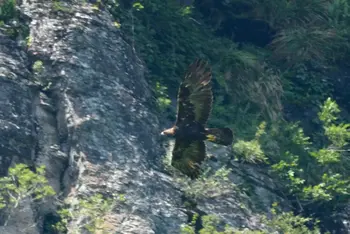 全長63cm。翼開長174cmはいずれもメス。全身ほぼ黒褐色をした大型の猛禽で、成鳥では頭が金色になります。そのため英名はGolden eagle。若鳥には翼に大きな白斑が出、尾羽の根元も白色です。「ピィーウ」あるいは「ポィョー」と聞こえる声をだします。餌はノウサギなど哺乳類、ヤマドリなど大型鳥類、アオダイショウなどが主。翼をゆるいV字型に保って、グライディングで飛ぶことが多いです。そして空中あるいは樹上や岩上などで餌動物を見つけると急降下して捕らえます。そのため枝の混んだ森林の中まで追いかけて行くことはできないので、広い草原や急な崖地で草や木が育ちにくい場所、雪の積もらない場所などで獲物を探します。巣は崖の岩棚につくるものが多いのですが、大木につくるものもいます。