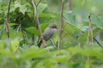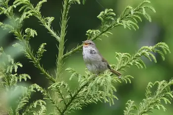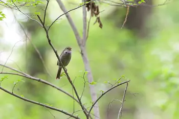 全長15.5cm(オス)。細身でオス・メス同色ですが、メスは2cmほども小さいのが普通です。日本では全国の平地から山地の林やその周辺にある藪で繁殖します。秋冬には山地のものは平地へ下ってきます。その頃は「チャッ チャッ」という声を出しています。「ホーホケキョ」。この鳴き声ゆえに、知らぬ人はいない、日本人にいちばん親しまれている鳥といえるでしょう。いつもヤブの中にかくれていて姿を見せないことが多いのですが、声ははっきりきこえます。ホーは吸う息、ホケキョは吐く息、胸をいっぱいふくらませてさえずります。「ホーホケキョ」と鳴くのは早春ということになっていますが、山登りをする人なら、「ホーホケキョ」は春先から盛夏まで聞くことができます。早春、人里で上手に「ホーホケキョ」と鳴く練習をしていたウグイスは、春の深まりとともに山へ帰って、巣づくりをするのです。また、オスが繁殖期に出す声のひとつを「谷渡り」といい、警戒を意味するといわれています。