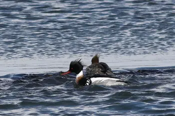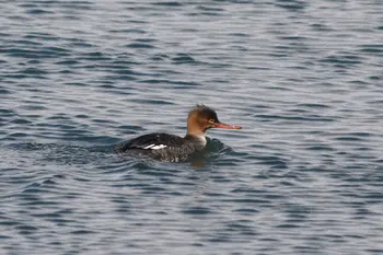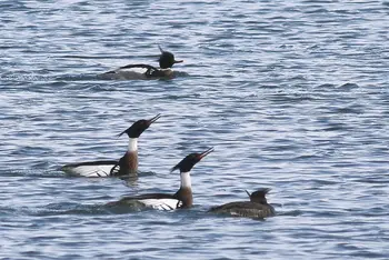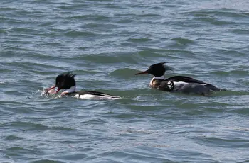 全長59㎝(オス)、52㎝(メス)。派手な色をして、カモのような体に、ウのような細いくちばしですが、カモの仲間です。カモの仲間としては、体が細長く、首も長めで、脚は体の後方に付いていて、脚の力のみで潜水ができます。オスは頭が緑黒色で、後方になびく冠羽は二段に見え、背は黒色。翼の上面は黒色で、大きな白斑があります。くちばしは細長く、先が鉤になっていて、捕えた魚をしっかり挟むのに役立ちます。このくちばしは潜水して魚を捕える形をしています。カモ類の中でもっぱら魚食なのはアイサ類のみです。メス、若鳥ならびにオスの冬羽は頭が赤味のある褐色、背など上面は薄い黒褐色で、脇は灰色です。冬羽では、目を囲むように白点があります。
