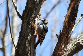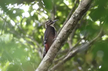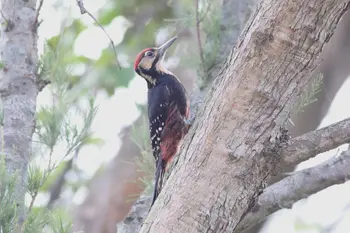 全長28cm。黒色と白色と赤色のキツツキ。背は黒色で、腰は白色。翼の上面は黒と白の模様。胸は白色で黒く細い縦斑がある。下腹は桃赤色。オスは頭頂が輝くような赤色。メスにはこの赤色がありません。北海道から九州までの森林に生息し、西日本では高い山地にすんでいます。奄美大島には亜種オーストンオオアカゲラが生息していて、色彩では全身の黒味が強いです。よく似ているアカゲラは、腰が黒色で、背後から見ると翼の肩の辺りに大きな白斑が左右に出ます。食べ物は昆虫類の幼虫が多いですが、秋冬には木の実も食べています。餌の多い夏季は葉についた虫を捕らえることも。最もキツツキらしく木を叩いて餌を探すのは、容易に餌が捕らえにくくなった冬であることが多いようです。春には、枯れ木を連続して叩いて大きな「タララララ・・・」との音を出しますが、これは他の鳥のさえずりに当たるもので、同種の仲間に、自己の存在を知らせる役割が大きいようです。