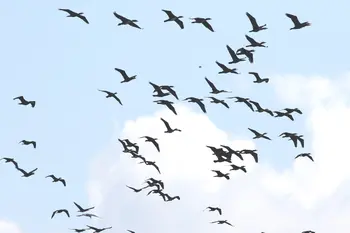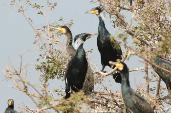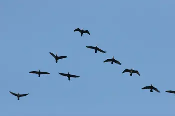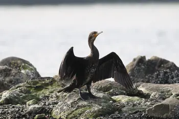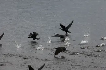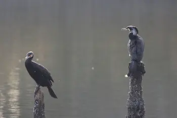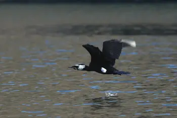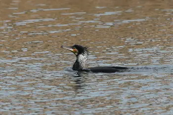 全長81cm。全身ほぼ黒色の、ガチョウほどもある大型の水鳥。成鳥の背・翼の雨覆羽には、褐色味があります。くちばしの先は挟んだ魚を逃さないように鉤型です。首、体も長め。水上では体が低く沈んだ姿勢で泳ぎます。足は体の後方にあって、指全ての間に膜になったみずかきがあり、泳ぐのも潜水するのも達者にこなします。魚類を水中で捕らえ、水面まで運んで飲み込みます。飛び立つときには助走が必要で、その場合は、両足をそろえて跳ねています。白鳥などは片足を交互に出して水上を走りますが、ウ・ペリカン類は、両足を揃えて跳ねています。巣は一般に樹上で、枝を組んでつくります。多数が集まって、集団で繁殖するのが普通。ユーラシア大陸、アフリカ、オーストラリア大陸などにも分布している、広域繁殖種。日本では青森県以南~九州で繁殖しています。内湾、湖沼、河川などに生息します。近年は個体数の増加が著しい。1960年代には、全国で2000羽ほどしかいませんでしたが、現在は首都圏だけでも1万羽どころではないと考えられています。そのため、東京の上空をガン類に似た棹になり、鉤になりして飛行する姿を見ることができます。