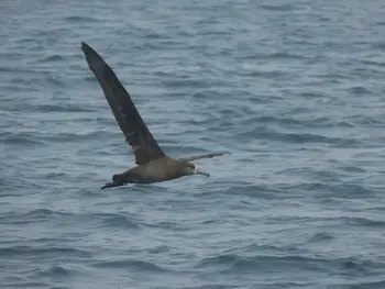 全長80cm。翼をひろげるとおよそ200cmになります。全身暗褐色で、額と目の下が白色です。成鳥になれば、腰の下や足の付根あたりが白くなるものもいます。体の割に翼は細長く、荒天のときも翼をややたたみ加減にしてスマートに力強く飛び、数日間飛びつづけることも稀ではないほどです。赤道より北の北太平洋に広くすんでいて、日本でも伊豆諸島南部の鳥島、小笠原諸島、硫黄列島、尖閣諸島などで繁殖しています。繁殖期には島へ戻ってきて番い相手と出会い、翼を半ば開いて、向かい合ってダンスを踊り、番の絆を強めていきます。餌は魚類やイカ類などを食べています。集団をつくって繁殖しています。そんな離島の地上でも、海上でも人に出会うことがなく、人を恐れることがないために、こん棒でなぐり殺され羽毛布団にされてきた歴史があります。