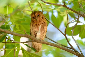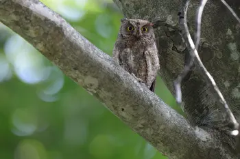 全長20cm。日本では北海道、本州の山地の大木のある森林で繁殖します。繁殖期には夜中から夜明けにかけて、「ブッ カッ コー」とか「ブッ ポー ソー(仏法僧)」ときこえるコノハズクの声がします。日本でいちばん小さいフクロウの仲間です。ブッポウソウという鳥が別にいて、昔はそれが鳴いていると思われていたのですが、姿はキレイでも声は「ゲエッ」という悪声で、これは「姿のブッポウソウ」となり、コノハズクが「声のブッポウソウ」となりました。空中を飛んでいる昆虫類などを食べています。木の葉のように小さなミミズクの意でコノハズクです。