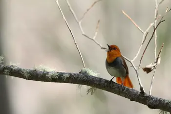 全長14cm。オスメスともよく似た色彩をしています。日本では夏鳥で、ほぼ全国の山地の森林にすんでいます。オレンジ色が鮮やかです。スズメくらいの大きさなのに、「ヒンカラカラカラカラ・・・」と、おどろくほど力強くうたいます。この声が馬のいななきに似ているところから駒鳥(コマドリ)の名がつきました。渓流に近いところにいることが多いので、瀬音の中にひびく声を聞くと、いっそう趣きが深いものがあります。一沢一駒といわれることが多いので、渓流にすんでいてなわばりをしっかり持っていることがわかります。
